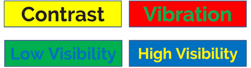 • Folosiți combinații care maximizează vizibilitatea, cum ar fi alb pe negru, galben pe negru sau roșu pe alb.